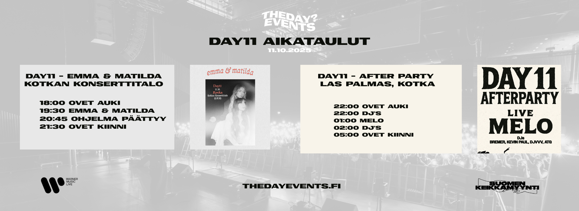 DAY11 tapahtumaan saapuu esiintymään täysin omanlaisesta soundistaan tunnettu kaksikko emma & matilda. Tapahtumapaikaksi valikoitui artistiduon tunnelmaa täydellisesti tukeva Kotkan Konserttitalo, joka on tunnettu tunteikkaista keikoistaan.
