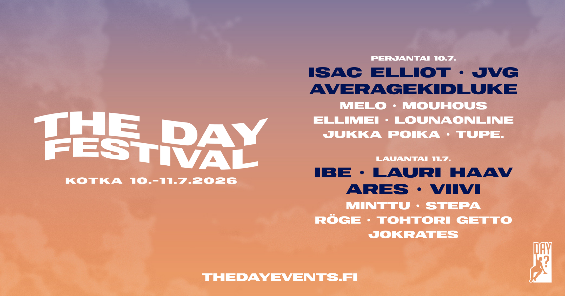 The Day Festivalissa esiintyvät mm. ibe, Isac Elliot, JVG, Lauri Haav, Ares, Averagekidluke, VIIVI, MELO, Mouhous, Minttu, Stepa, Jukka Poika, Röge, Tohtori Getto, ELLIMEI, Jokrates, louna0nline & Tupe.