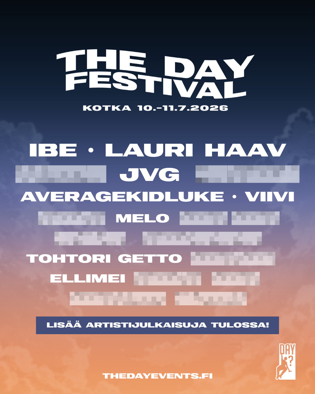 Kaksi osaa artisteja julkaistu! The Day Festivalissa esiintyvät mm. ibe, Lauri Haav, Ares, JVG, VIIVI, Averagekidluke, MELO, Mouhous, Minttu, Tohtori Getto, ELLIMEI, Jokrates & louna0nline. Lisää artistijulkaisuja tulossa keväällä!